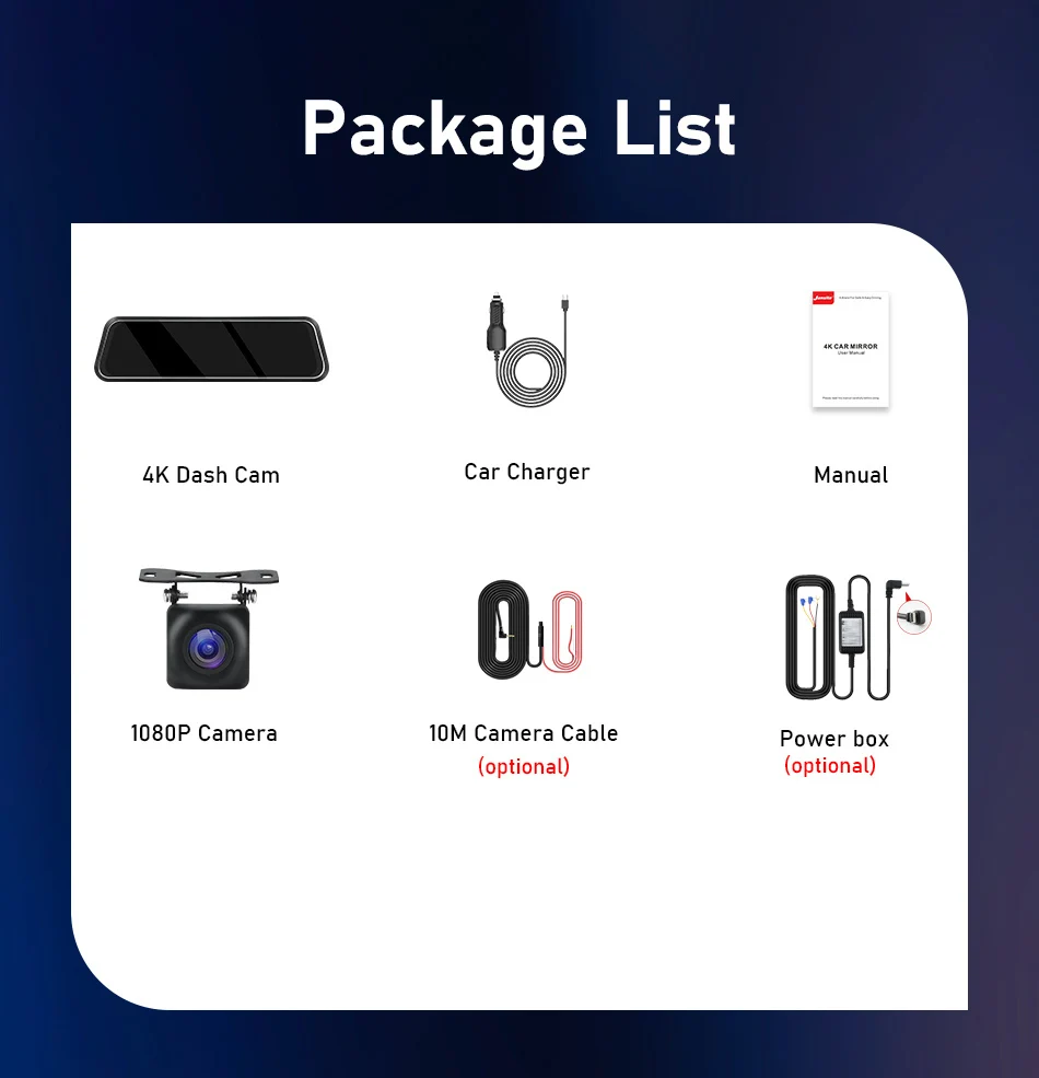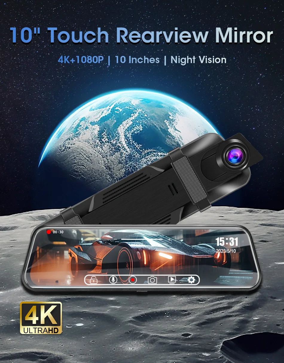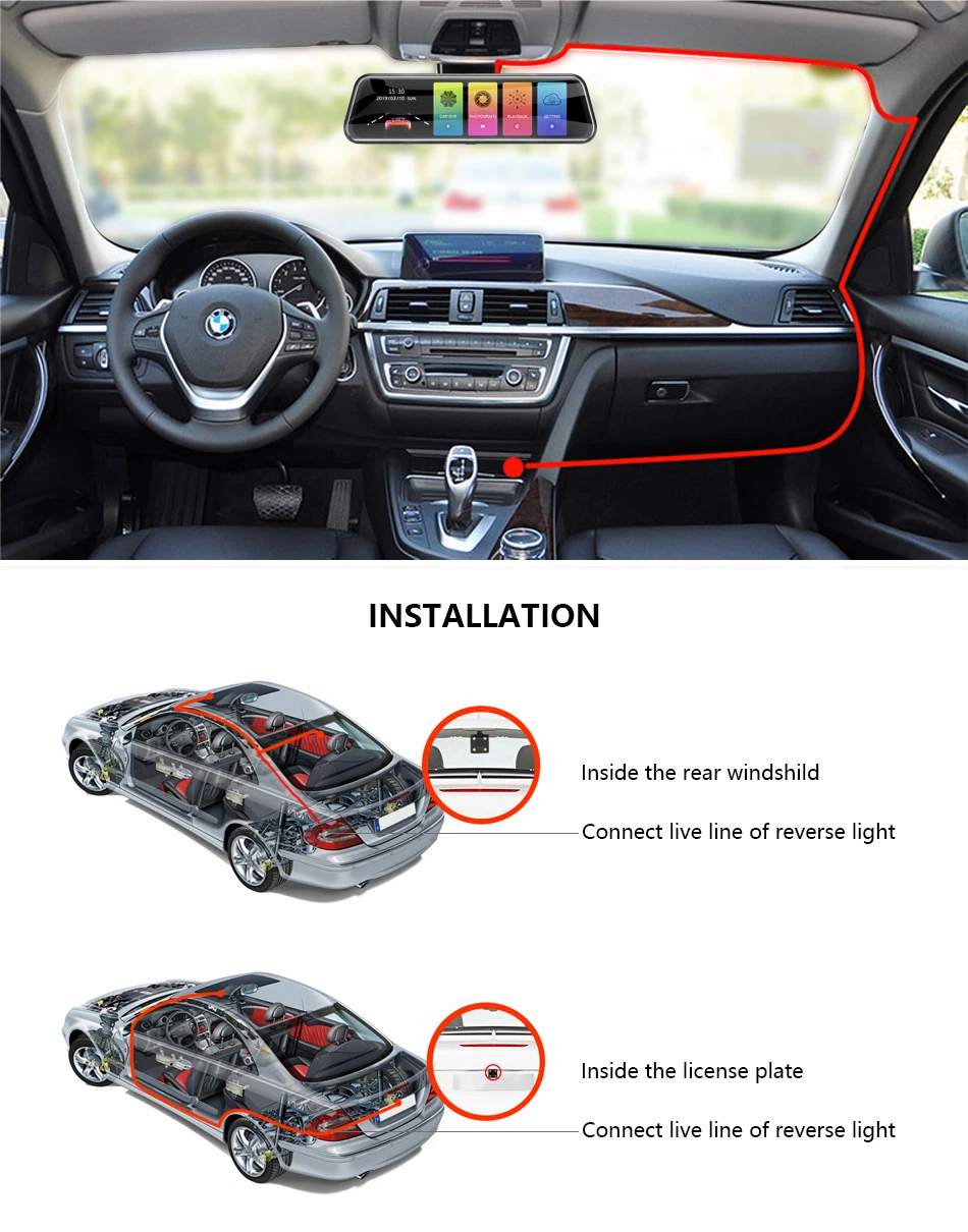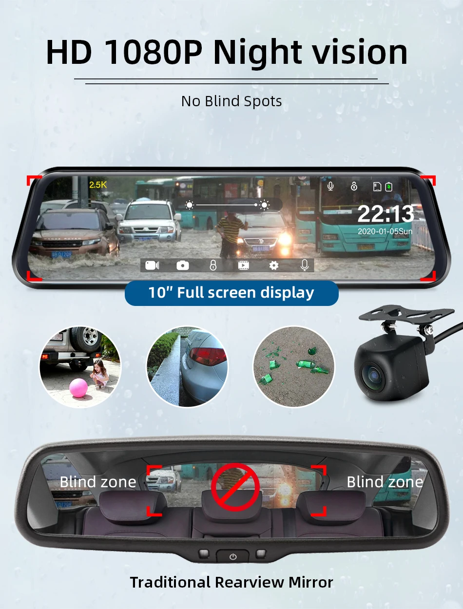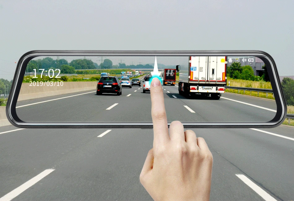 Quando o carro está dando ré, o dispositivo muda automaticamente para a visualização da imagem da câmera traseira por meio de uma tela de espelho total de 10 polegadas.Ele vem com imagens de alta qualidade que ajudam a identificar detalhes importantes, como placas, movimentos do motorista e funções rodoviárias que podem provar sua inocência.