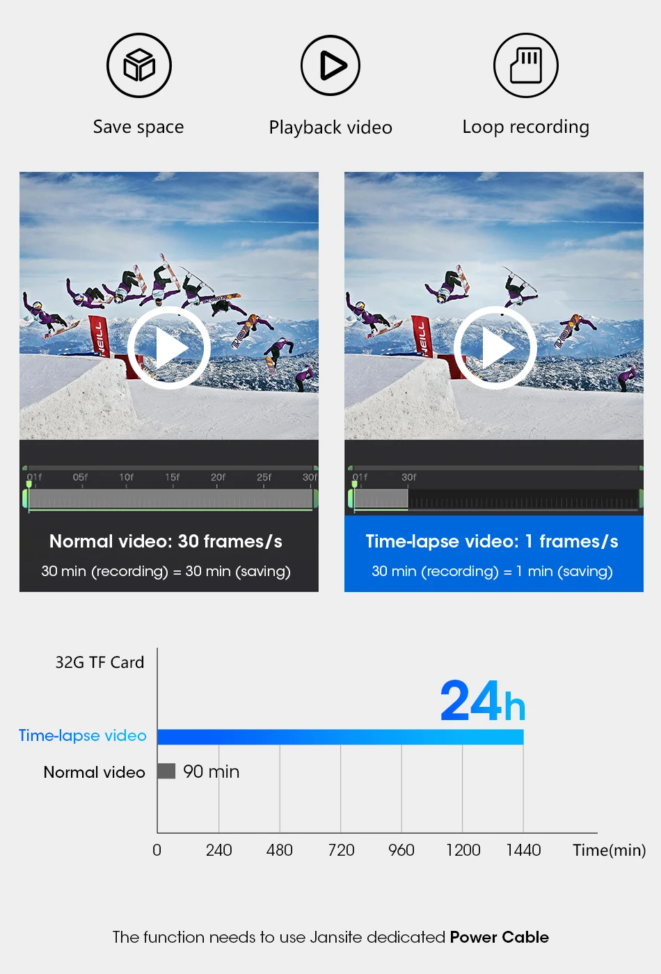 O vídeo com lapso de tempo pode ser gravado continuamente por 24 horas, mais seguro e conveniente